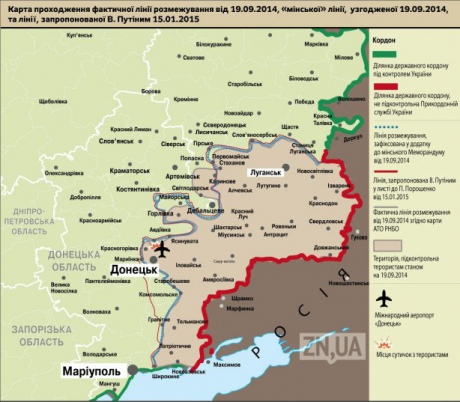 | Линия соприкосновения бойцов и боевиков на Донбассе по состоянию на 15 января 2015 года |