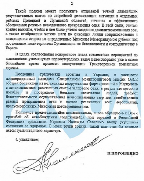 Ранее пресс-служба президента Украины сообщила, что в интервью польскому телеканалу TVN-24 Порошенко заявил, что в письме Путину он "потребовал не только прекращения огня и выполнения Минских договоренностей, но и освобождения Надежды Савченко и всех заложников".