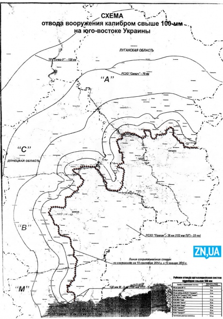 Издание также публикует карту, которая прилагалась к письму Путина президенту Украины: "Линия соприкосновения сторон по состоянию на 19 сентября 2014 г. и 13 января 2015 г.".
