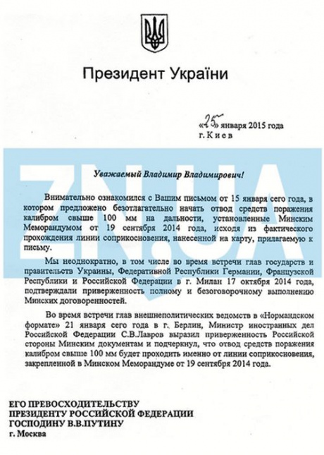 | Письмо Порошенко Путину от 25 января 2015 года. Копия ZN.ua |