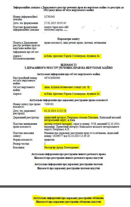 В октябре 2014 он также был оформлен на ООО "Киевстройжилье", однако по результатам договора купли-продажи перешел к тому же Артуру Ростомяну. Данных о наложении ареста в реестре также не было.