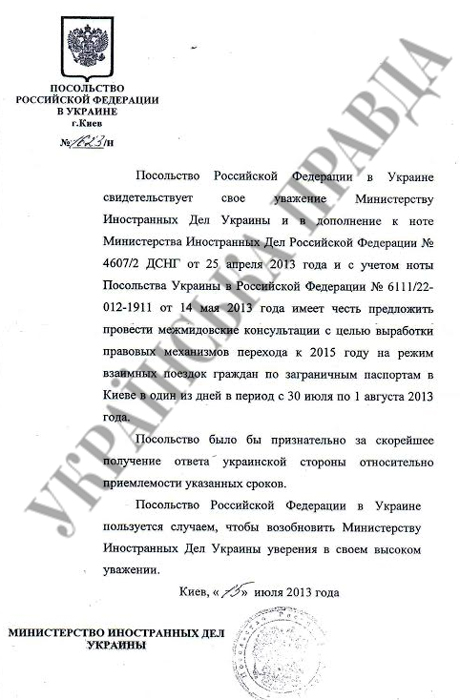 В ней российский МИД, ссылаясь на предыдущую ноту выступает инициатором проведения консультаций между ведомствами "с целью наработки правовых механизмов перехода к 2015 году на режим взаимных поездок граждан по загранпаспортам".