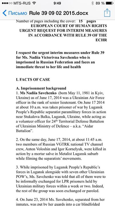 Адвокаты Надежды Савченко подали заявление в Европейский суд по правам человека с просьбой срочно принять "предварительные меры" для рассмотрения ее дела.
