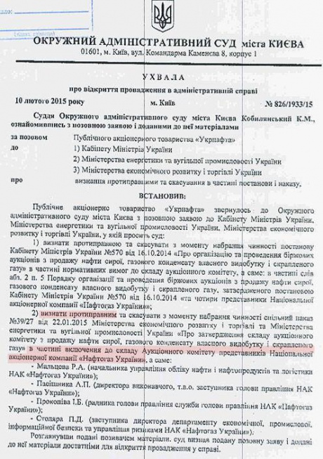 В частности, "Укрнафта" требует отменить решение Кабмина от 16 октября 2014 года о введении в состав аукционного комитета по продаже сырой нефти, газового конденсата и сжиженного газа четырех представителей "Нафтогаза" и исключить этих представителей.