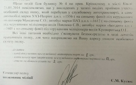 Указанный автобус ПАЗ имеет специальный номерной знак 1611. Автор записи также опубликовал документ за подписью бывшего руководителя "Беркута" Сергея Кусюка, который сейчас скрывается, согласно которому в задержании активистов "Автомайдана" 23 января 2014 года на Крепостном переулке в Киеве принимал участие милиционер-водитель С. Павлюк.