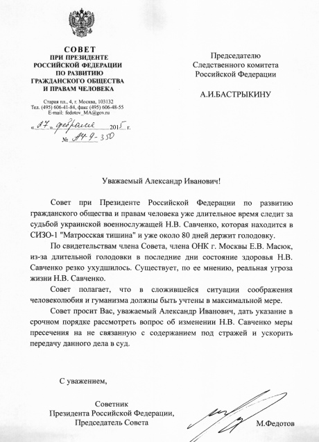 Обращение было подготовлено по инициативе члена СПЧ Елены Масюк, которая посещала Савченко в СИЗО во время ее длительной голодовки.