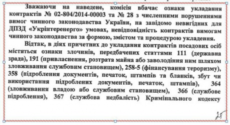 "Комиссия усматривает признаки заключения контрактов с многочисленными нарушениями требований действующего законодательства Украины, на заведомо невыгодных "Укринтерэнерго" условиях, несоответствие контрактов требованиям действующего законодательства по форме, содержанию и процедуре заключения", - говорится в приведенном документе.