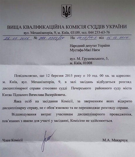 "А завтра ждем всех желающих на заседании Высшей квалификационной комиссии судей, где будет рассматриваться дисциплинарное производство в отношении судьи. Заседание начнется в 10:00 по адресу г. Киев, ул. Механизаторов, 9", - добавил депутат.
