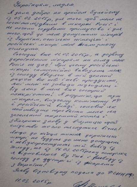 "Если до конца недели украинские врачи не будут к мне допущены и не откорректируют мой выход из голода, то с 16.03.2015 года понедельника я отказываюсь от пищи и выведения из голода до встречи с врачами из Украины", - подчеркнула Савченко.