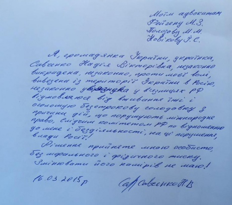 Позже информацию подтвердили адвокаты Савченко и обнародовали обращение украинки.