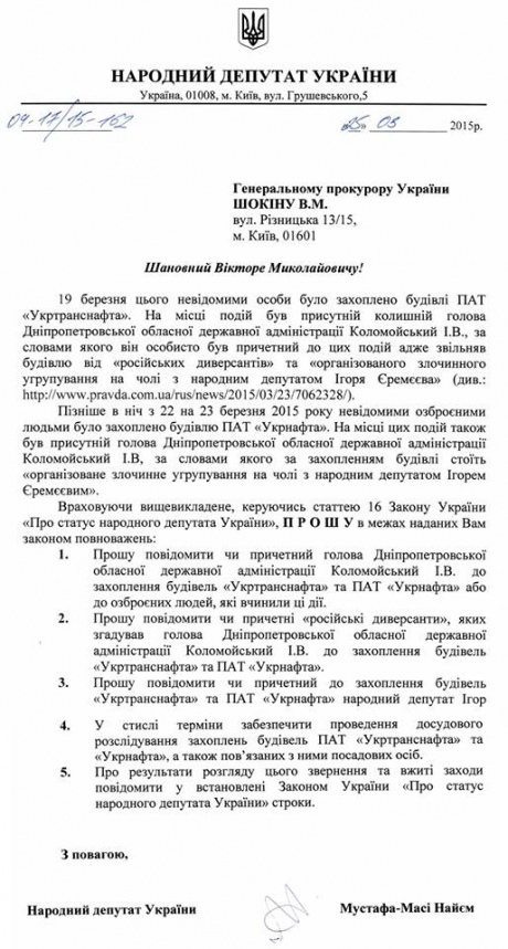 Народный депутат фракции БПП Мустафа Найем просит Службу безопасности и Генпрокуратуру проверить причасность депутата Игоря Еремеева и олигарха Игоря Коломойского к "захвату помещений" предприятий "Укрнафта" и "Укртранснафта".