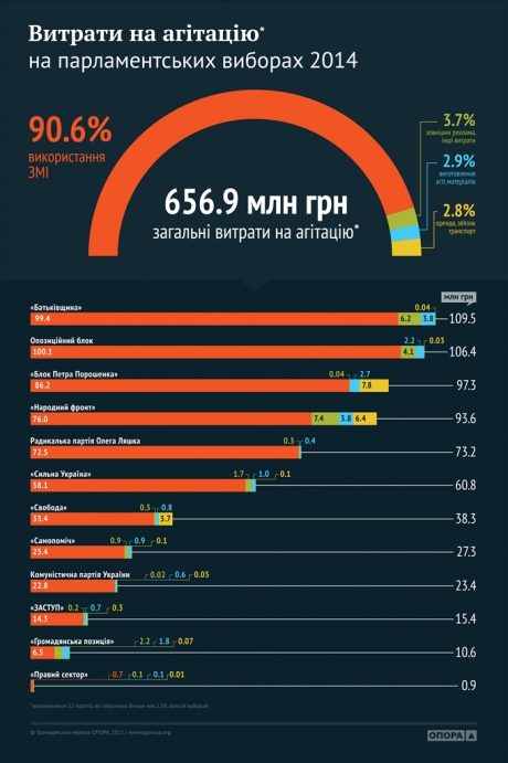 Как отмечает Александр Неберикут, аналитик ОПОРЫ, расходы на использование СМИ (эфирное время на телевидении, радио, материалы в печатных СМИ) составили более 90% всех официальных партийных расходов на агитационную кампанию.