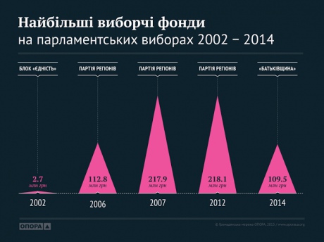 Отмечается, что, несмотря на предельные ограничения на расходы избирательных фондов совокупная стоимость избирательной кампании на парламентских выборах постоянно росла: в 2002г. составила 32.2 млн. грн., выросла в 17 раз в 2006 году. До 552.1 млн. грн., в 2007 гг. - 579.2 млн. грн. (+ 5% от предыдущей компании), в 2012 гг. - 601.3 млн. грн (+ 4%), в 2014 гг. - 674.5 млн. грн. (+12%).
