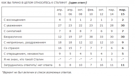Так, 30% россиян с уважением относятся к Сталину, 2% - с восхищением, 7% - с симпатией, безразлично- 30%. Плохо относятся к Сталину – 20% россиян.