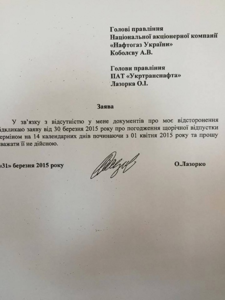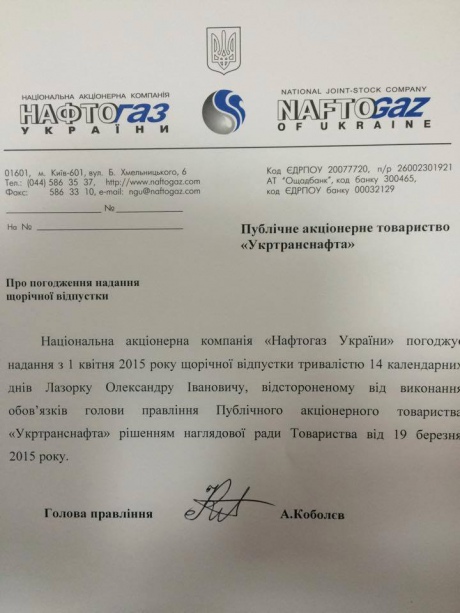 Этот отпуск была согласована с "Нафтогазом". Причиной отзыва названо отсутствие в Лазорко документов о его отстранении.