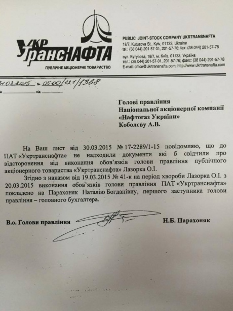 В свою очередь Наталья Парахоняк, которую Лазорко назначил руководить компанией на время своего отсутствия, сообщила руководителю "Нафтогаза" Андрею Коболєву, что в "Укртранснафту" не поступали документы об отстранении Лазорко.
