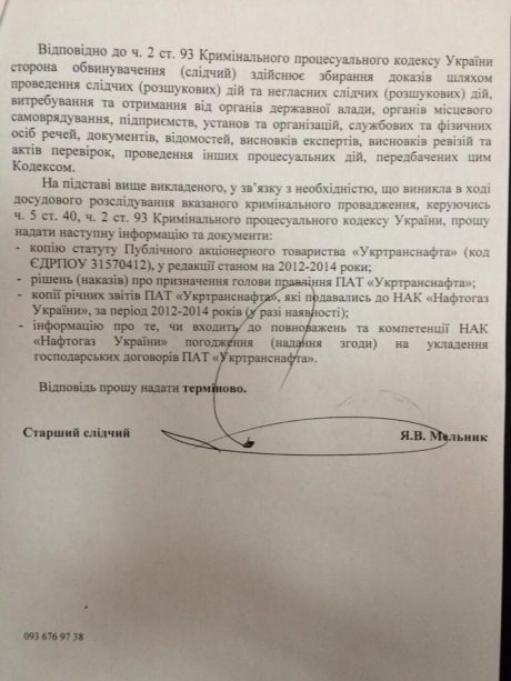 В связи с этим следователь попросил у "Нафтогаза" предоставить копию устава "Укртранснафты" в редакции по состоянию на 2012-2014 годы, решений о назначении председателя правления компании, годовых отчетов за этот же период, а также информации о том, уполномочен "Нафтогаз" согласовывать хозяйственные договора "Укртранснафты".