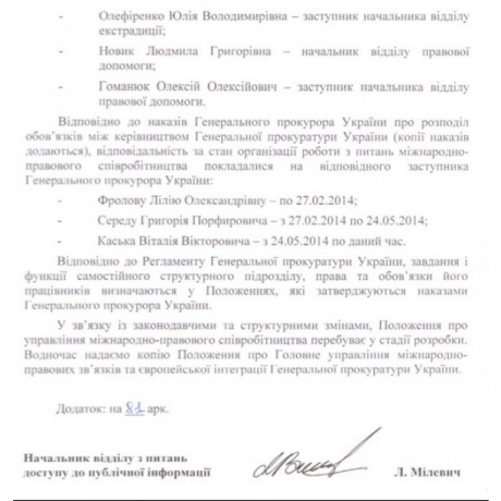 В соответствии с приказами генпрокурора о распределении обязанностей между руководством Генпрокуратуры, ответственность за состояние организации работы по вопросам международно-правового сотрудничества со времен Революции Достоинства возлагалась на таких заместителей Генерального прокурора: Лилию Фролову (по 27.02.2014), Григория Середу (с 27.02.2014 по 24.05.2014), Виталия Касько (с 24.05.2014 по настоящее время).