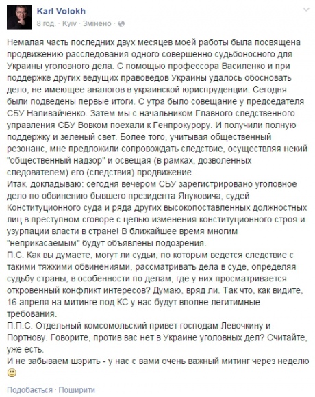 "СБУ зарегистрировано уголовное дело по обвинению бывшего президента Януковича, судей Конституционного суда и ряда других высокопоставленных должностных лиц в преступном сговоре с целью изменения конституционного строя и узурпации власти в стране! В ближайшее время многим "неприкасаемым" будут объявлены подозрения", - сообщил он.