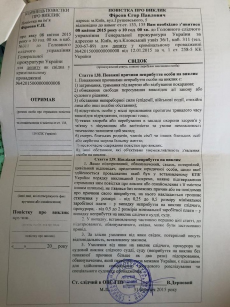 Также Фирсов разместил в своем Facebook фото повестки о вызове на допрос в уголовном производстве №42015000000000008.