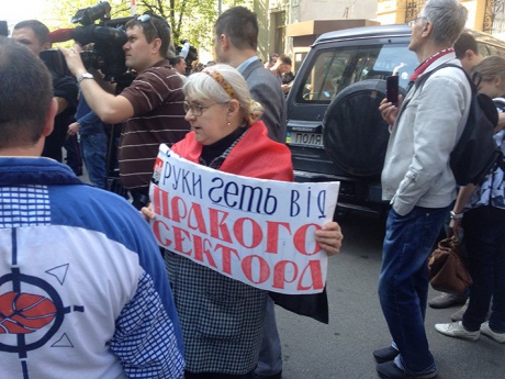 Корреспондент "ОстроВа" сообщает, что митингующие держат плакаты "Руки прочь от Правого сектора".