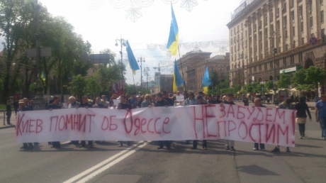 Люди несли плакат "Киев помнит об Одессе. Не забудем. Не простым", а также фотографии убитых людей, таких как Олег Калашников, Олесь Бузина, Валентина Семенюк, Вячеслав Чорновил и почему-то Джон Кеннеди.