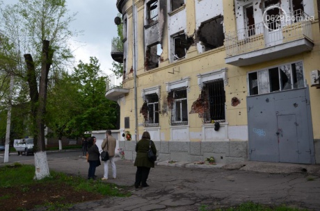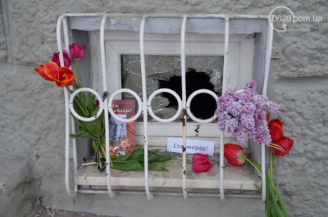 | Мариуполь, ГУ МВД в День победы. Надпись на окне: "Сталинград" |