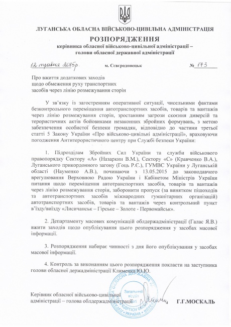 Отмечается, что Москаль подписал распоряжение о запрете пересечения линии разграничения, проходящей через Луганскую область, для любых транспортных средств, включая легковые автомобили.