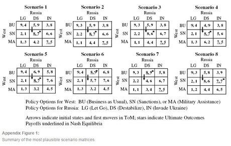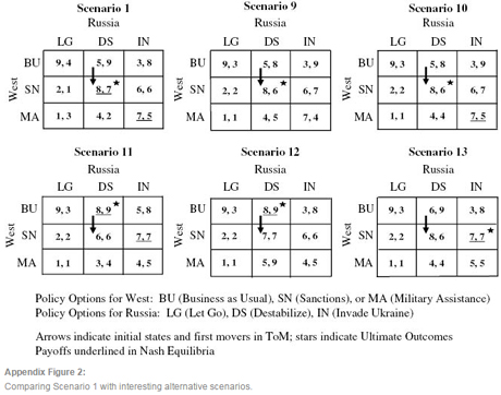 Эриксон и Зигер составили 13 различных сценариев. В большинстве состояние равновесия - это "санкции"/"дестабилизация".