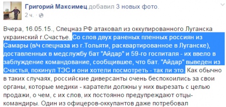 Вместе с тем в Facebook врач диспансерного отделения из Луганска Григорий Максимец сообщил: "Со слов двух раненых пленных россиян из Самары (в/ч спецназа из г.Тольяти, расквартированное в Луганске), доставленных в медслужбу бат "Айдар" и 59-го госпиталя - их ввело в заблуждение командование, сообщившее, что батальон "Айдар" выведен из Счастья, покинул ТЭС и они хотели посмотреть - так ли это".