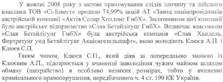 Согласно документу, в 2007 году братья Клюевы через подконтрольные фирмы решили принять участие в приватизации 74,99% акций указанного завода, но не имели на это права, поскольку их фирмы не обладали необходимыми патентами и технологиями.