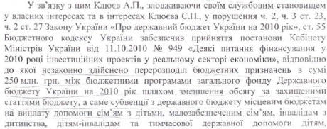 Поскольку этих денег у Госагентства не было, Клюев добился перераспределения расходов госбюджета за счет средств из защищенных статей бюджета, предназначенных изначально для субвенций местным бюджетам на выплату помощи семьям с детьми, малообеспеченным семьям, инвалидам с детства, детям-инвалидам и временной помощи детям.