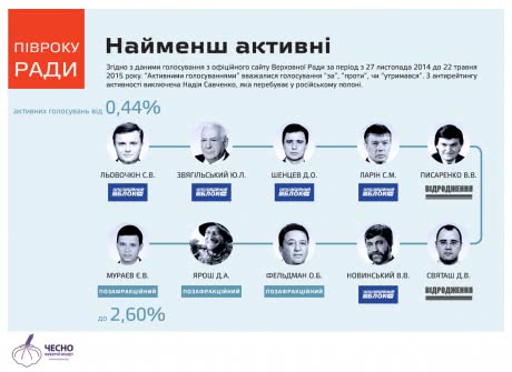 Активисты "Честно" также определили топ-10 депутатов, чьи карточки были наименее активными за полугодие. Здесь снова большой группой являются депутаты из фракции "Оппозиционного блока".