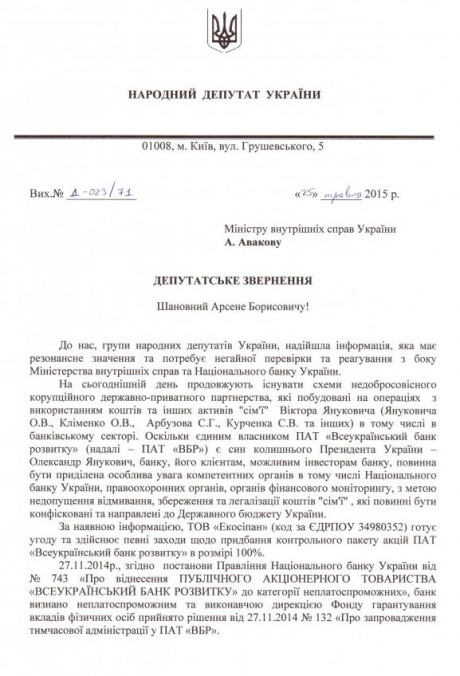 По информации нардепа, ООО "Экосипан" путем договоренностей в Фонде гарантирования вкладов, НБУ, Антимонопольном комитете и в судебных органах получил необходимые разрешения и согласования на покупку "ВБР".