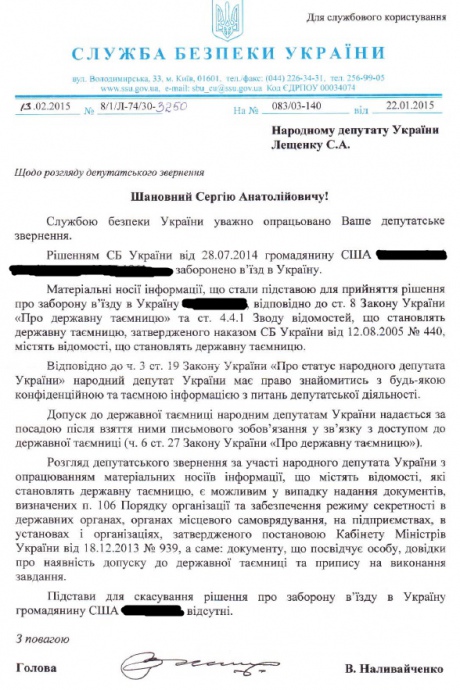 В частности, речь идет о бизнесмене-гражданине США, которому решением СБУ был запрещен въезд в Украину. Фамилия этого человека не разглашается, поскольку она содержится в документах под специальным грифом.