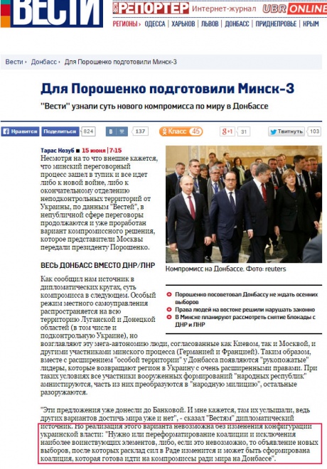 Позже издание также опубликовало материал о якобы переданных Кремлем предложениях для "Минска-3". Там, в конечном счете, предлагалось сменить конфигурацию власти, намекали и на создание "широкой коалиции" с Оппозиционным блоком. Боевики и околокремлевские спикеры неоднократно заявляли, что в Украине и на Донбассе будет мир в случае смены власти в Киеве.