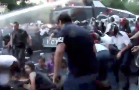 Отмечается, что силовики задерживают участников, а также применяют водометы против сидящих на асфальте людей.