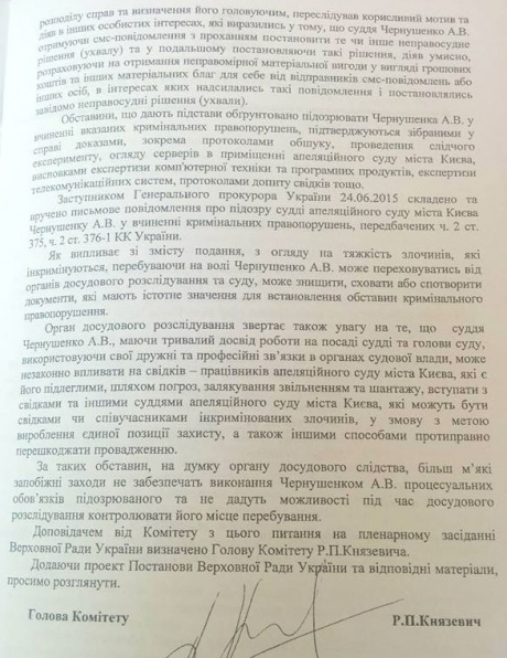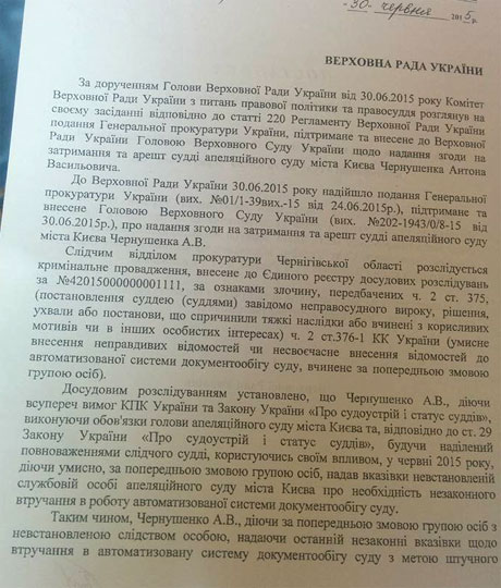 В представленных документах отмечается, что досудебным расследованием установлено, что Чернушенко в июне 2015 года предоставил указания неустановленной должностному лицу апелляционного суда Киева о необходимости незаконного вмешательства в работу автоматизированной системы документооборота.