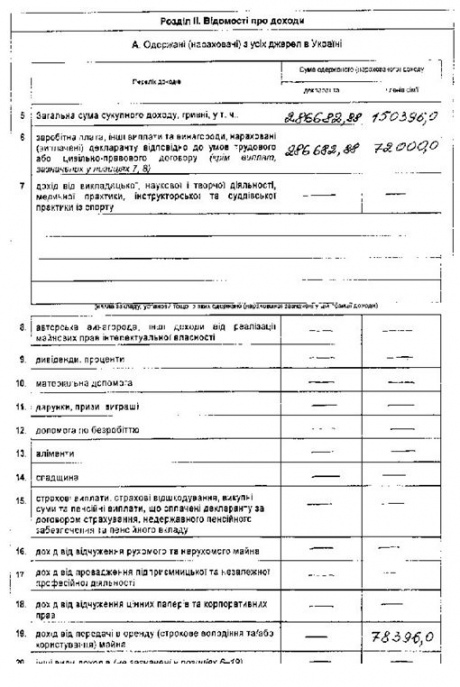 Его жена Ольга задекларировала более 150 тысяч гривен дохода, из которых зарплата составляет 72 тысячи, а остальное – доход от сдачи имущества в аренду.