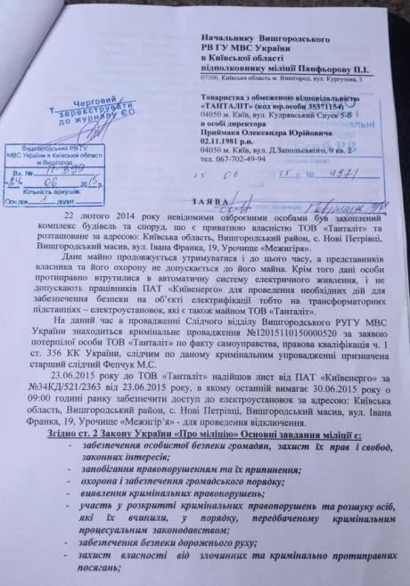 Кувита продемонстрировала "Украинской правде" заявление Прыймака в милицию, в котором тот заявил, что 22 февраля 2014 года "неизвестными вооруженными людьми был захвачен комплекс строений и сооружений, которые являются собственностью ООО "Танталит" и находятся … в "Межигорье", - сказано в заявлении.