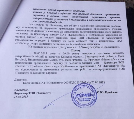 При этом он жалуется, что эти люди "противоправно вмешались в автоматическую систему электроснабжения и не пускают сотрудников Киевэнерго для проведения необходимых действий для обеспечения безопасности на объекте, т.е. еа тирансформаторных подстанциях электроустановках, которые являются также собственностью "Танталита", - скзано в заявлении.