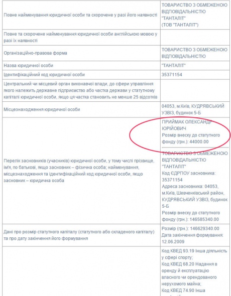 Прыймак стал собственником "Танталита", купив долю за 44 тысячи гривен при сумме уставного капитала в почти 147 миллионов гривен. Директором Танталита Прыймак стал 26 декабря 2014 года.