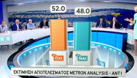 Как сообщает телеканал ERT, по итогам четырех экзит-полов, на референдуме от 49,5% до 54,5% избирателей сказали "нет" требованиям кредиторов, от 45,5% до 50,5% - "да".