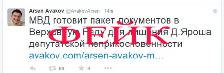 Твиттер-аккаунт Министра внутренних дел Арсена Авакова взломан с фейковым сообщением о якобы подготовке документов о снятии с руководителя Правого сектора, депутата Дмитрия Яроша неприкосновенности.