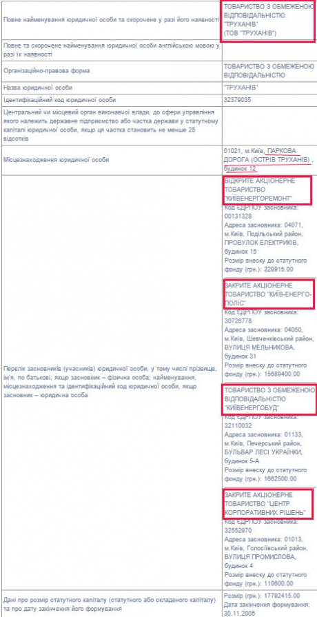 Согласно тексту решения Окружного админсуда Киева от 07 февраля 2013 года, ОАО "Киевэнергоремонт" является правопреемником арендного предприятия "Киевэнергоремонт", зарегистрированного Подольской районной в городе Киеве госадминистрацией 16.05.1995., Имеет структурное подразделение "Труханов", который находится по адресу 01021 м. Киев, Парковая Дорога, 12.