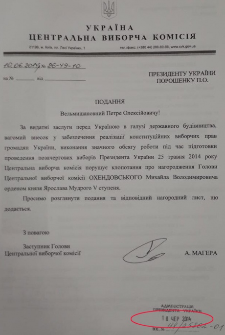 "Это было представление от 10 июня 2014 по результатам выборов президента Украины как оценка заслуг и Председателя ЦИК и всей ЦИК в условиях фактических военных действий на Востоке Украины", - сообщил "Украинской правде" Магера и напомнил, что тогда удалось получить результат на 8 округах Донецкой области и 2 округах Луганской