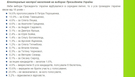 Как известно, среди опрошенных КМИС респондентов в мае, проголосовать за Порошенко были готовы 13,6% избирателей.