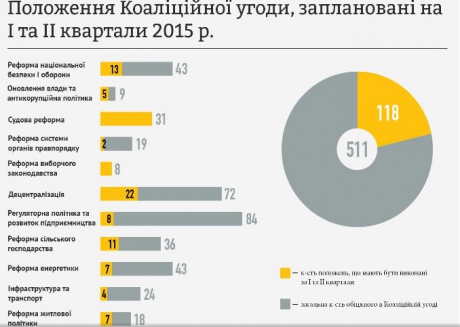 Так, по состоянию на середину июля коалиция сумела выполнить лишь 39 из 118 положений Соглашения, которые были запланированы на первое полугодие 2015-го.