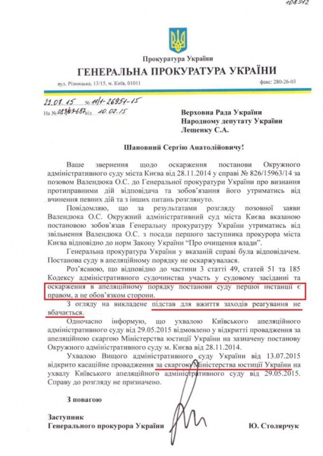 Замгенпрокурора Юрий Столярчук объяснил нежелание ГПУ обжаловать запрет люстрации зампрокурора Киева тем, что это не "обязанность, а право ГПУ".