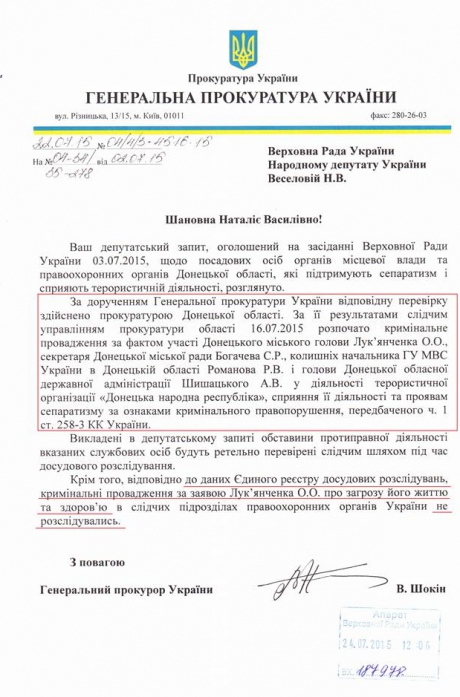"Следственным управлением 16 июля 2015 года начато криминальное производство по фактам участия Донецкого городского головы Александра Лукьянченко, секретаря Донецкого городского совета Сергей Богачева, бывшего начальника Главного управления Министерства внутренних дел Украины в Донецкой области Романа Романова, главы Донецкой облгосадминистрации Андрея Шишацкого в деятельности террористической организации "ДНР", содействия ее деятельности и проявлениям сепаратизма", - сказано в ответе на запрос.